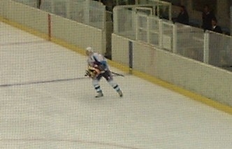 9分過ぎ、ペナルティ明けの山野。ペナルティボックスにスティックを忘れ、失笑を買う。スティックは大事な商売道具でしょ?。